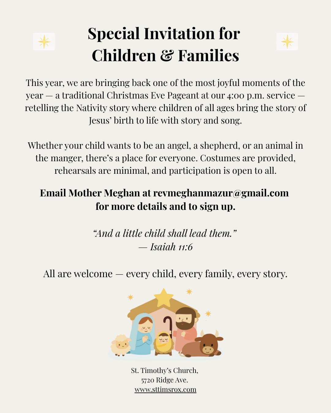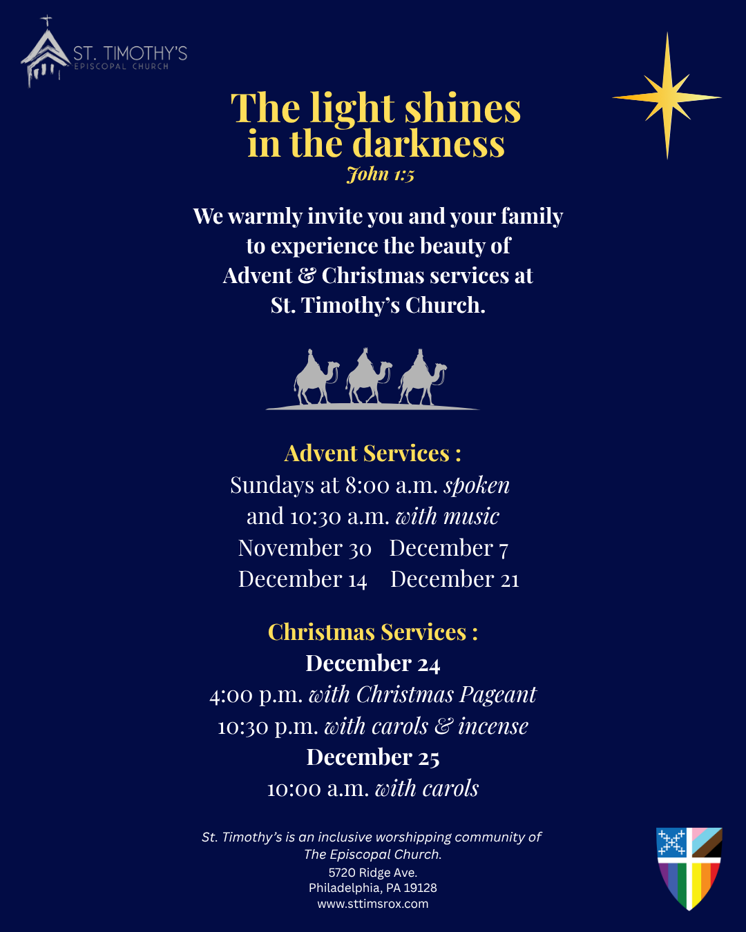 We worship in the beauty of the Episcopal tradition, while welcoming all of God's people with the radical hospitality shown to us by Jesus Christ. Our Mission is to build relationships with God, the community, and each other through faith and fellowship.